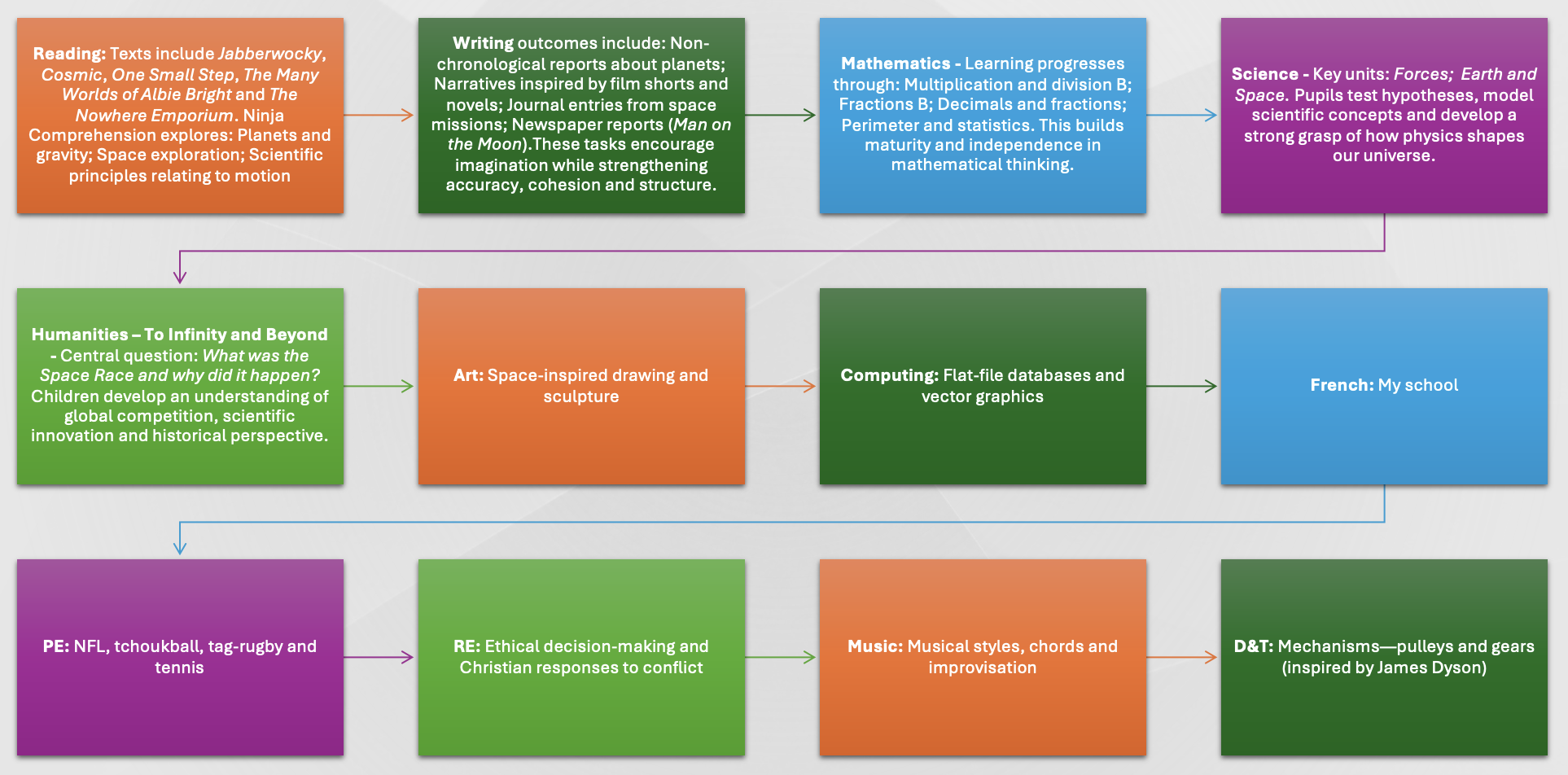 Spring takes learning into the cosmos. Pupils investigate the science of space, the history of exploration and the mysteries of our universe—combining STEM, literature and creativity in a term full of wonder.