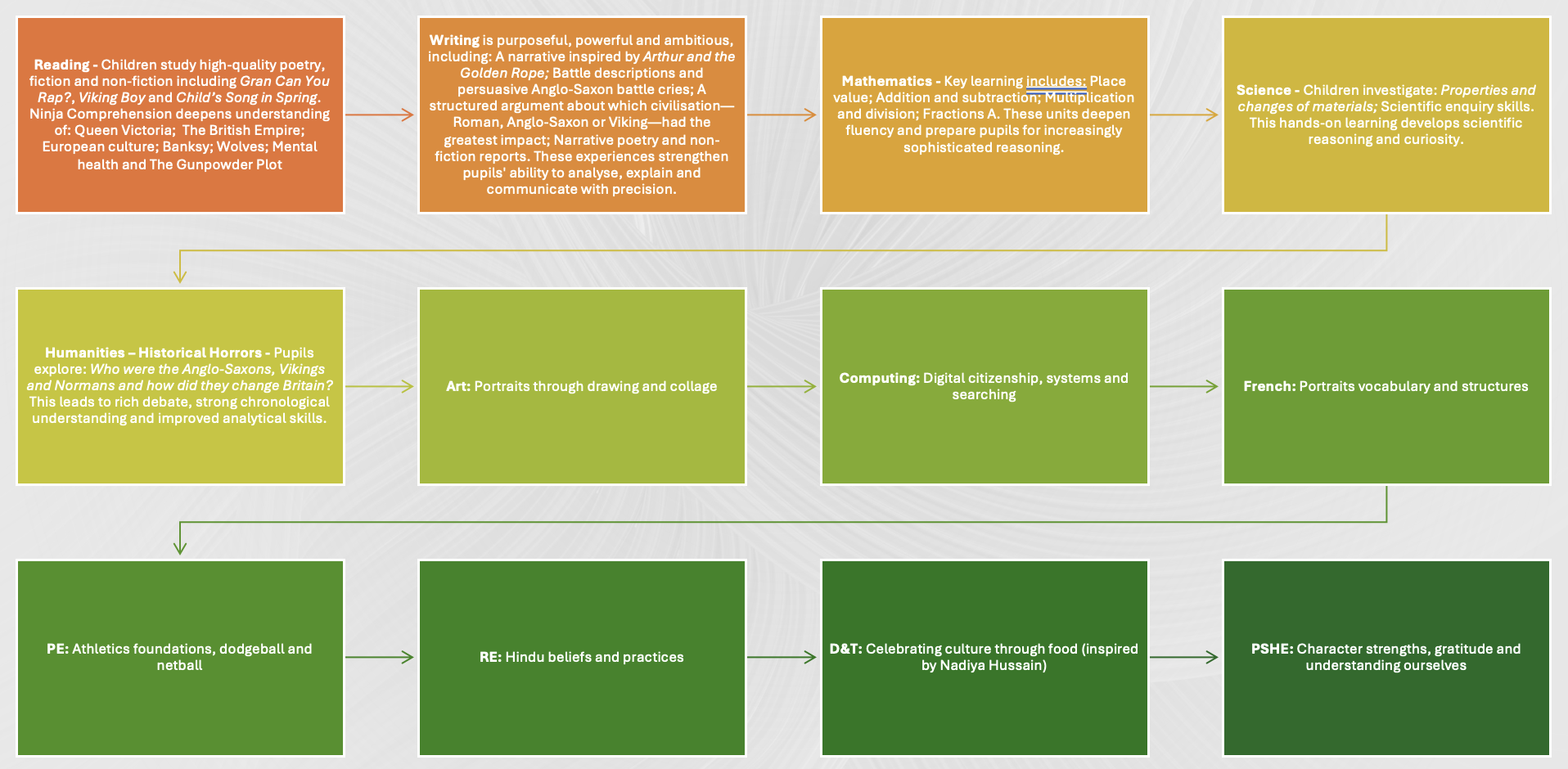 Autumn immerses pupils in the dramatic and decisive events that shaped early Britain: the Anglo-Saxons, Vikings and Normans. This theme brings together history, geography, reading and writing in a powerful exploration of cultural change and national identity.